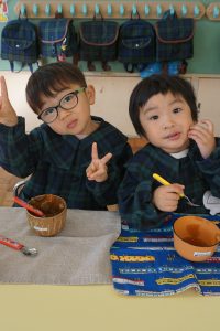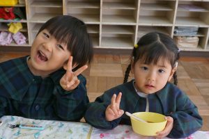 その後、年長組のお友達が、食べやすいように丸めてくれたお餅をお雑煮としていただきました。