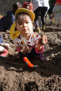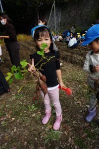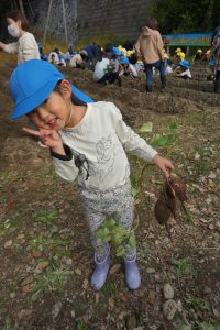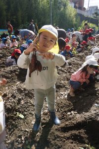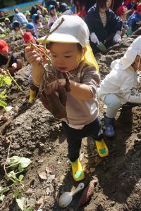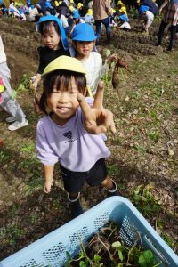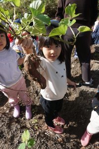 秋晴れの天気に恵まれた今日。幼稚園東側の芋畑で芋ほりを行いました。