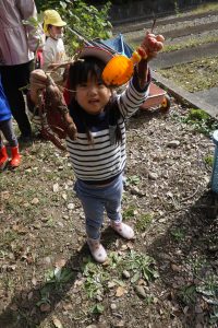 秋晴れの天気に恵まれた今日。幼稚園東側の芋畑で芋ほりを行いました。